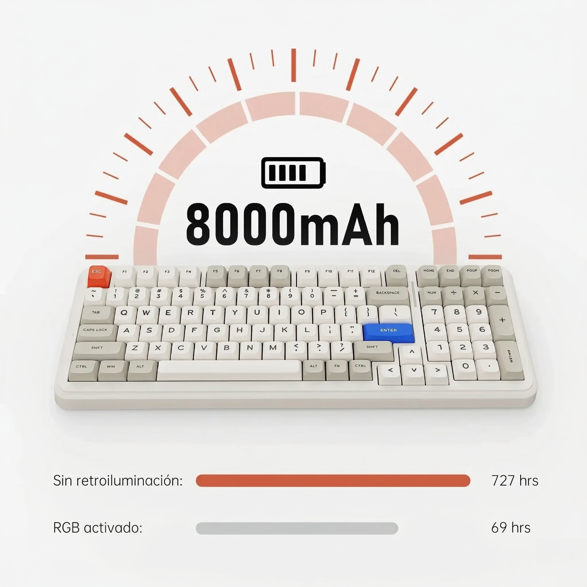 Con una potente batería de 8000 mAh, el K99 V2 te acompaña en cada sesión de juego y trabajo. Ofrece hasta 69 horas de uso con la iluminación RGB activada o hasta 727 horas con las luces apagadas, ideal tanto para maratones de gaming como para largas jornadas de trabajo.