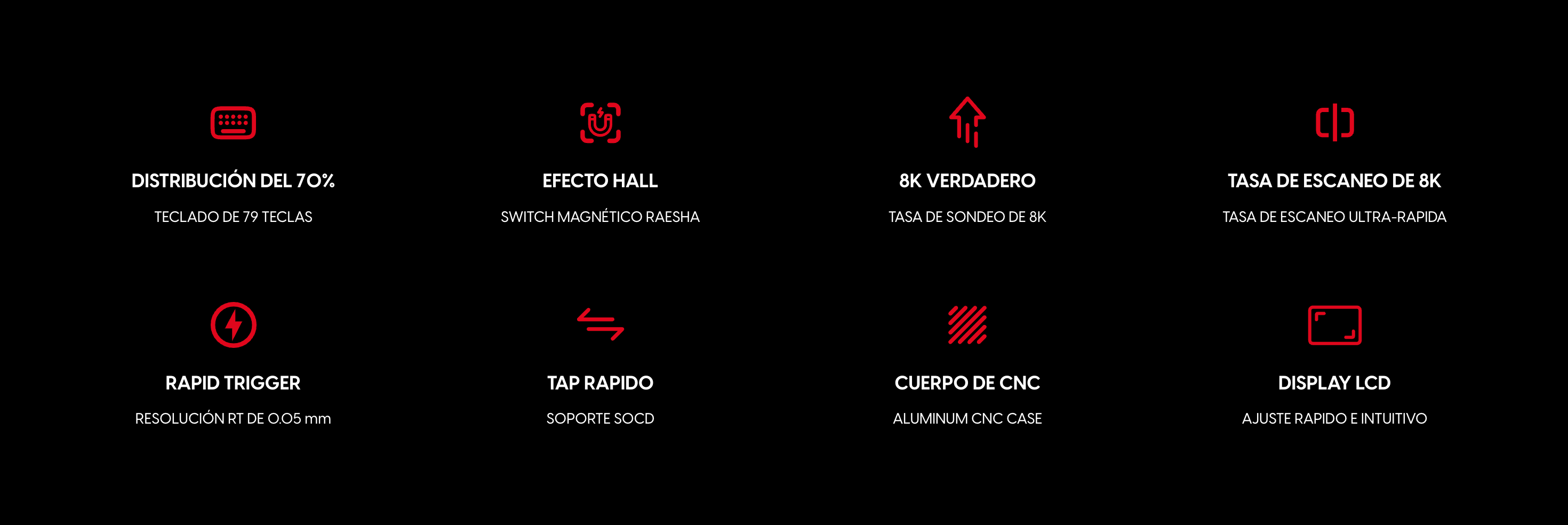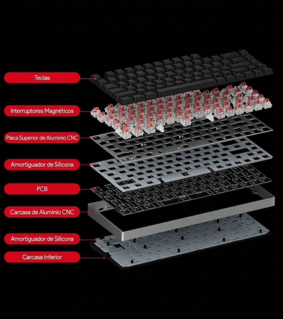 El switch magnético ofrece un recorrido completo de la tecla, detectando el punto de activación de cada tecla con una precisión de 0.05 mm.