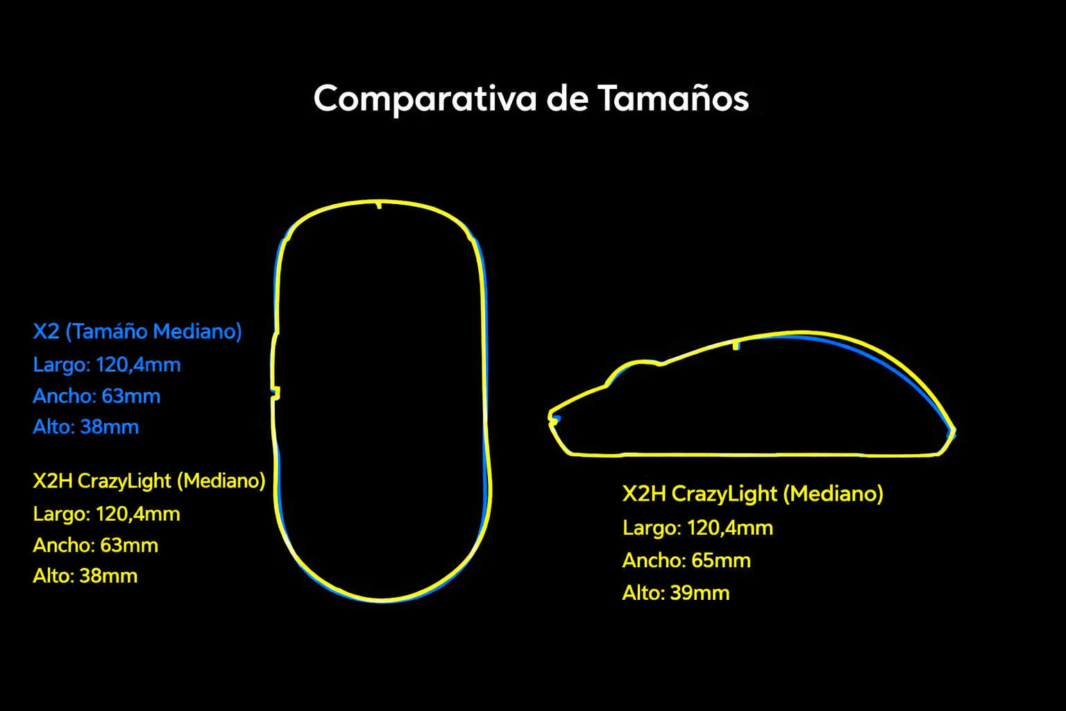 Tanto el X2H CrazyLight como el X2 tienen un diseño ergonómico simétrico vistos desde arriba, lo que te asegura un calce re cómodo y un control excelente. A diferencia del X2, el X2H CrazyLight tiene el lomo más alto, lo que te da mucho más soporte en la palma de la mano. Esto se traduce en un agarre más confortable, sobre todo si usás agarre de garra o garra relajada