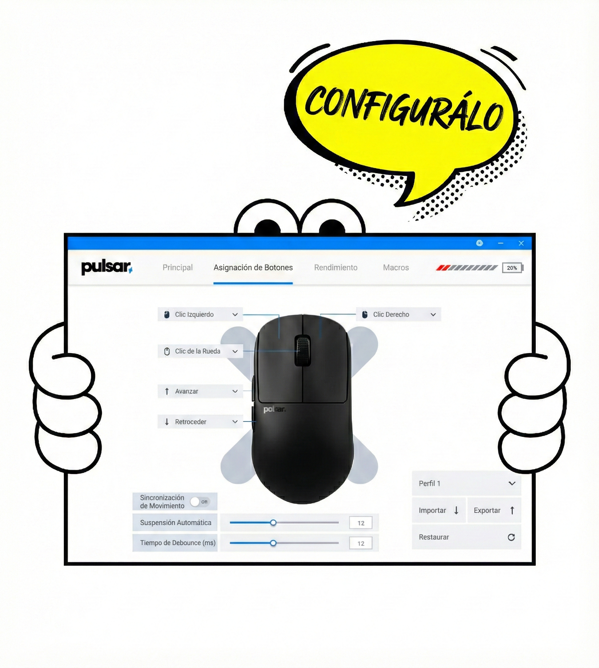 Te ofrecemos tanto una versión web como un software para PC, brindándote total comodidad sin importar dónde estés. Podés ajustar los DPI, el polling rate y las funciones de los botones con muchísima facilidad. Es una herramienta súper intuitiva diseñada para ayudarte a optimizar tu mouse y lograr una experiencia de juego fluida y de respuesta instantánea.