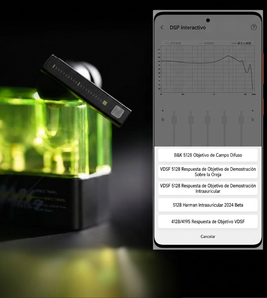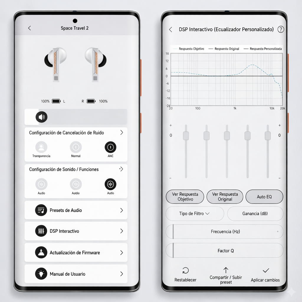 A través de la aplicación MOONDROP, recientemente actualizada, los usuarios pueden personalizar y depurar el ecualizador parametrizado del DSP de SPACE TRAVEL 2 mediante una nueva interfaz de ajuste profesional, más precisa e intuitiva. Esta interfaz permite ajustar parámetros como el tipo de filtro, el punto de frecuencia, la ganancia y el valor Q. Además, se dispone de una respuesta de frecuencia original como referencia durante el proceso de ajuste, lo que mejora aún más la usabilidad y la precisión.