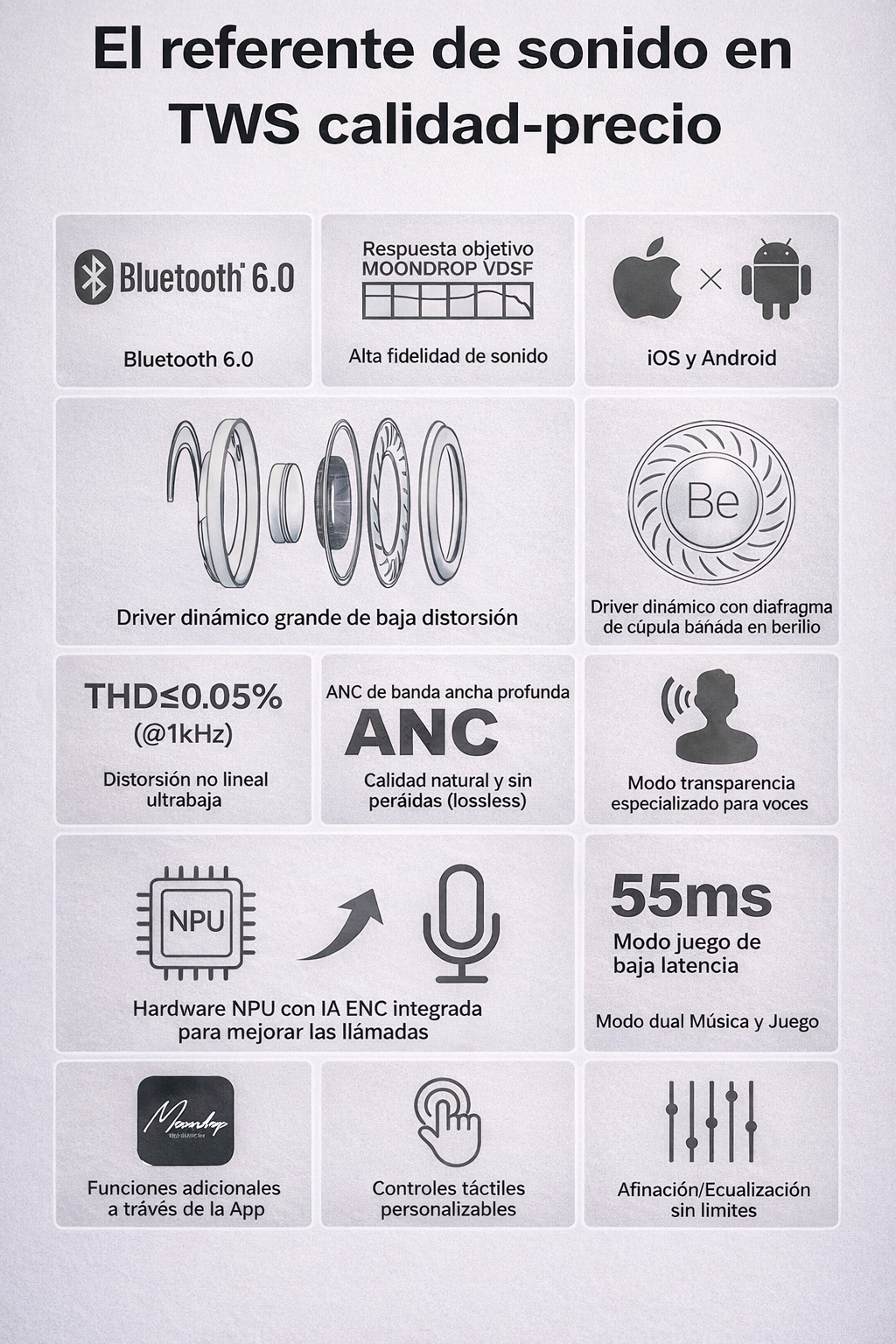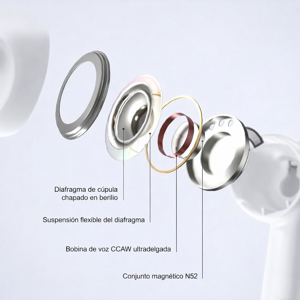 El controlador optimizado está compuesto por una bobina de voz CCAW importada y un conjunto magnético N52 que ofrece una respuesta más rápida y un timbre dinámico más consistente.
